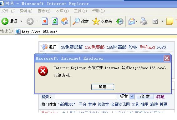 电脑今天发生怪事了:打开任何一个网页,甚至于启动一些需要与网络连接的程序(如瑞星杀毒、卡卡等),就会出现“Internet Explorer 无法打开Internet站点...(对应网址)。拒绝访问”的对话框(如附图)。但网页实际上仍能打开,只是任何一个链接都有这现象,好麻烦的。