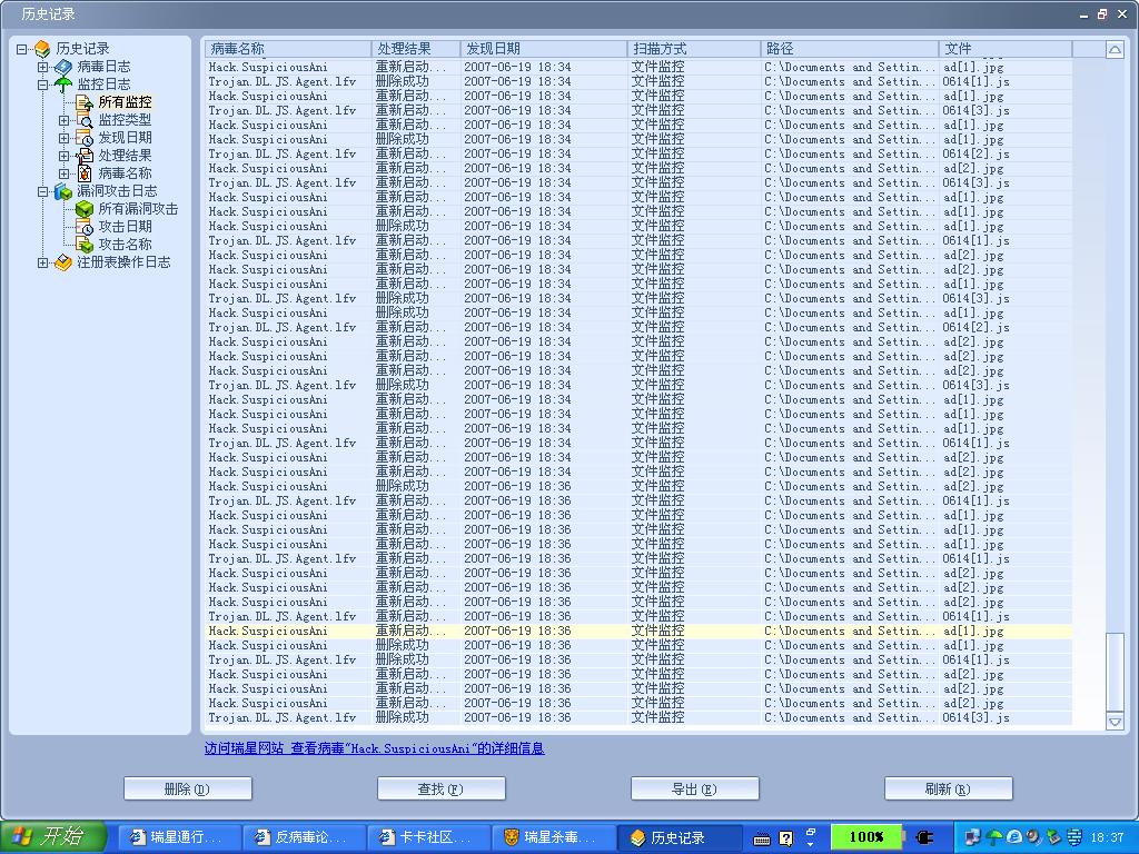 我晕啊,我和你的情况一下,下午一上网就不断报病毒。已经监控了361个病毒了,是瑞星误报还是怎么回事啊!!!