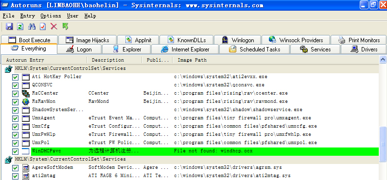 2、删除病毒添加的启动项、服务项(图4-图6)。