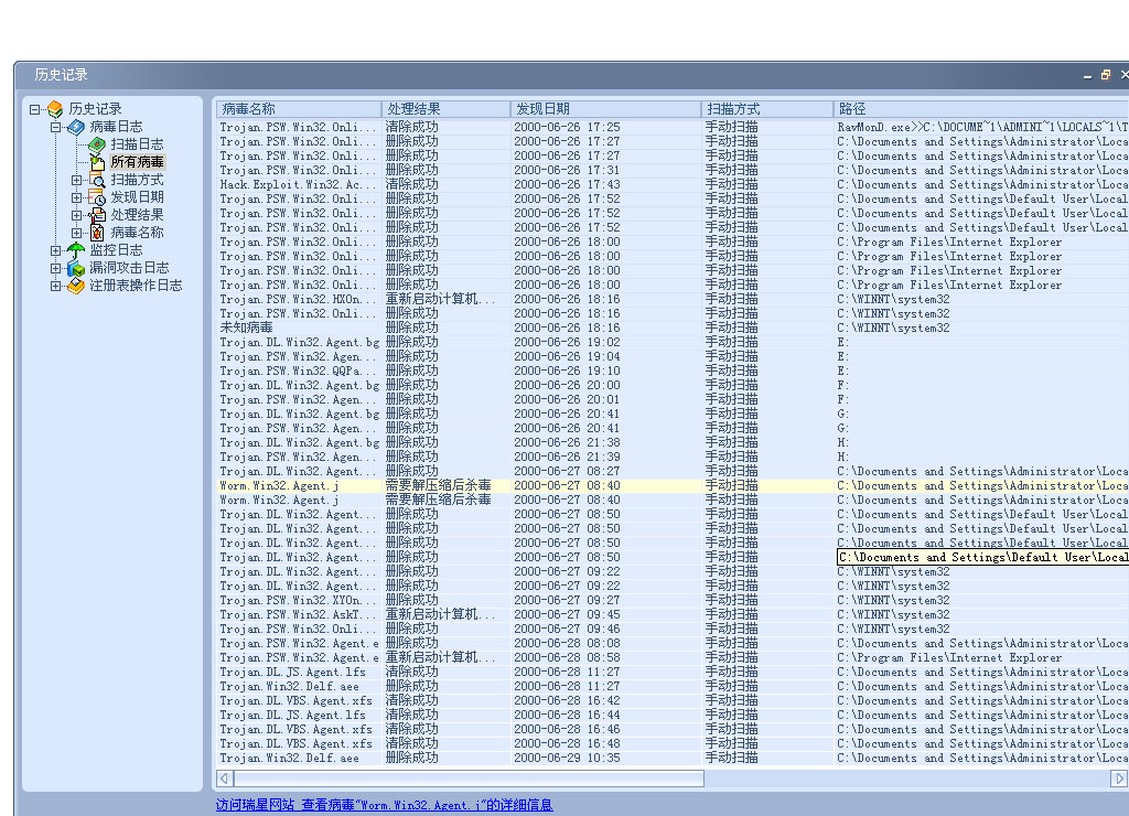 Worm.Win32.Agent.j 需要解压缩后杀毒2000-06-27 08:40      手动扫描C:\Documents and Settings\Administrator\Local Settings\Temporary Internet Files\Content.IE5\OR694B2P              ccc[1].htm>>/mm.exe>>upack0.34                                                                                          本机
