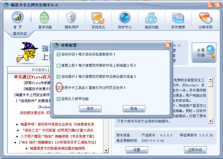 楼主可以在卡卡4首页的设置窗口里面启用卡卡工具条再试试