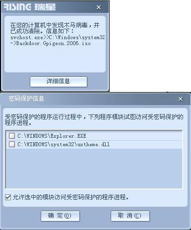 “在您的计算机中发现木马病毒,并已经成功清除。信息如下:svchost.exe>>C:\Windows\system32>Backdoor.Gpigeon.2006.iso”