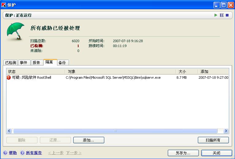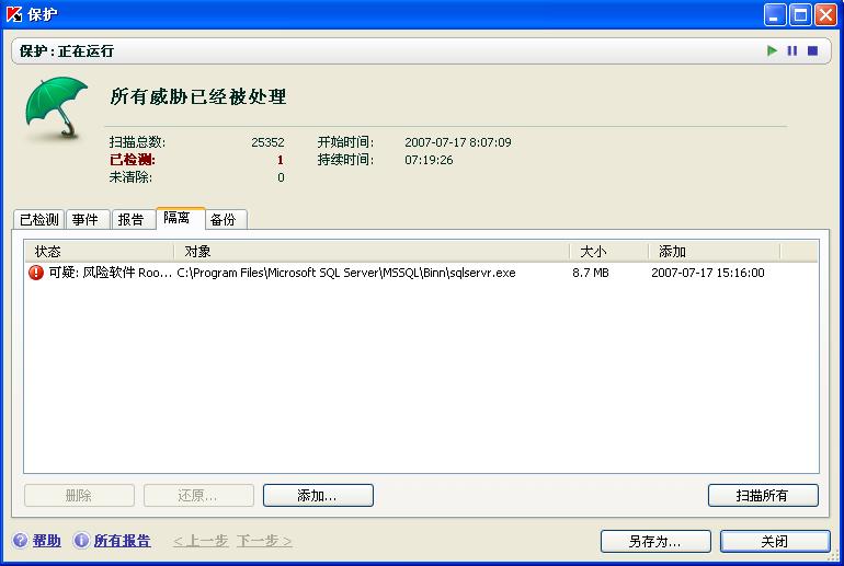 今天13点多的版本报SQL是风险软件,升级后从隔离里还原后再查就没事了