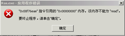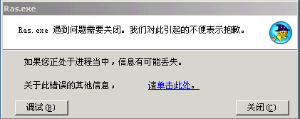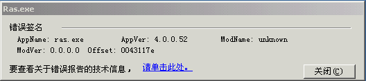 错误应用程序 ras.exe,版本 4.0.0.52,错误模块 unknown,版本 0.0.0.0,错误地址 0x0043117e。
