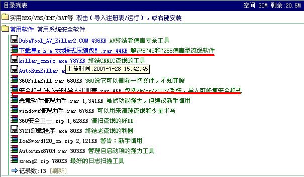 可以到我的网盘http://scj2007.ys168.com/去下载下图标出的那两个文件,运行第一个清理病毒,然后再运行第二个修复安全模式。
