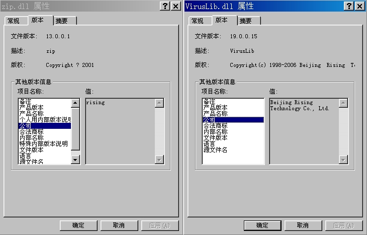 在瑞星目錄下發現一個可疑文件zip.dll的公司名称和瑞星目錄下的其他文件都不一样,是病毒吗?其他文件的公司名稱都是Beijing Rising Technology Co., Ltd.