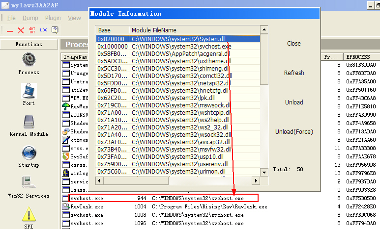 1、根据SRENG日志的进程号(PID)找到相应的svchost.exe进程,用IceSword强制卸除其中的病毒模块systen.dll