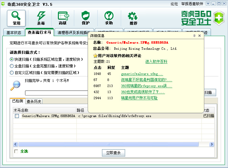 今天陆续接到用户反映360安全卫士把瑞星防火墙的rfwproxy.exe报为Generic/Malware.SFMg.8BE6B6DA的问题,咨询过瑞星工程师后,证明360安全卫士是误报,rfwproxy.exe是瑞星防火墙的家长保护组件。不是病毒!请大家放心使用!
