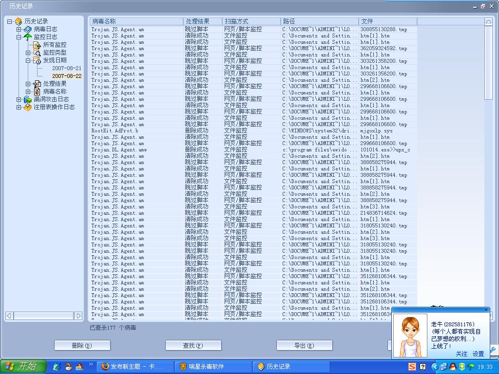 没打开一个网页,瑞星的网页监控都提示有网页病毒,Trojan.JS.Agent.am病毒。程序就是IE或者遨游,目标文件是我的文档的临时文件(每打开一个网页比如打开www.sina.com 发现都是先转到http://evilman.cn这个网站然后在进的新浪。报错估计就提示http://evilman.cn有病毒)。把系统补丁装完了,WINDOWS的临时文件夹,IE缓存都清空了,用瑞星杀了后。还是不停得到报那个错误