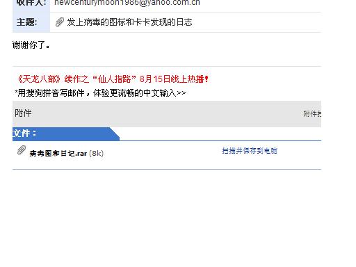 我明白了,你要那个病毒文件呀,我压缩传给你了,你要是在自己硬盘上打开就会传染,删也删不掉了。