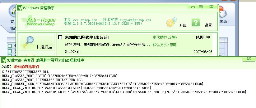 【侠客行难的贴子】今天下了一个windows清理助手,搜索提示发现一个未知风险软件(C:\WINDOWS\DDIEHELPER.DLL),如下图。请教以下这是一个怎样的东西?网上搜索也没有什么详细的解释,用瑞星查杀也没发现问题。