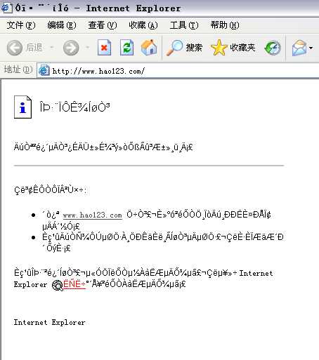 浏览器为IE6.0,昨天早上打开网页就是乱码,以为是编码选错了,但在查看下的编码下没有可选的项目,请问各位,我该怎么办?先谢谢了.