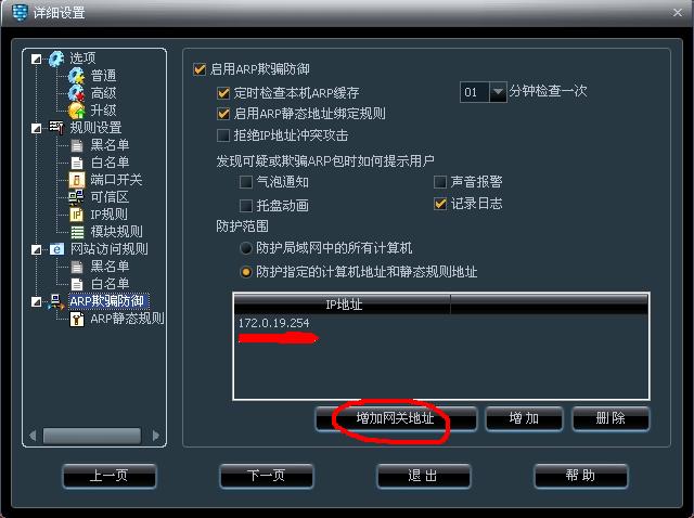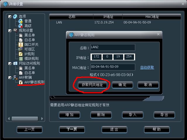 瑞星防火墙——设置——arp规则(最后一个)——添加——输入名称——点下面的获取网关