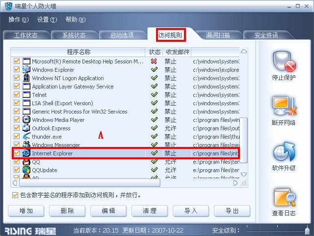 我系统装的瑞星防火墙2007 不知道为什么跨版本升级后就无法连接网络了 首先说我是局域网 没装瑞星杀毒 用的是卡巴 还有360和卡卡 我关掉瑞星防火墙后就能上网 可是打开后就不行了 大家帮帮忙吧~谢谢