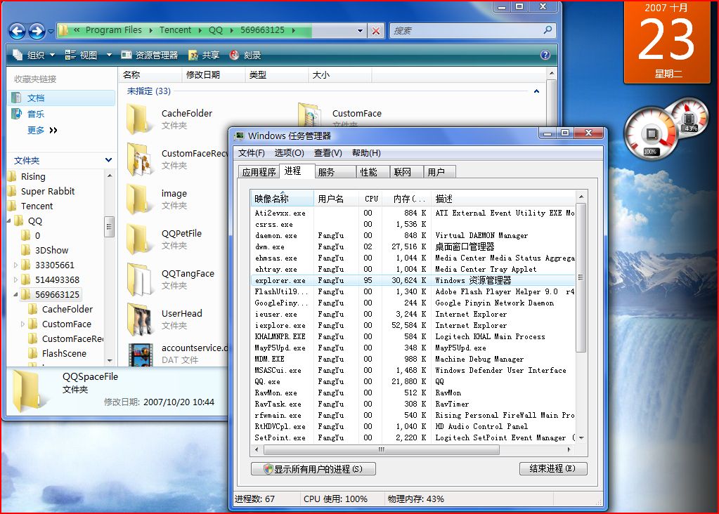 不知道什么时候开始,我的Windows Vista Home Premium 就开始出现问题:在打开一些文件夹时会发生explore占用100%cpu的情况(见截图),这个问题让我头疼很久了,但一只也没解决方法,很是郁闷,不知有没有高手可以帮我搞定这个问题,在下感激不尽