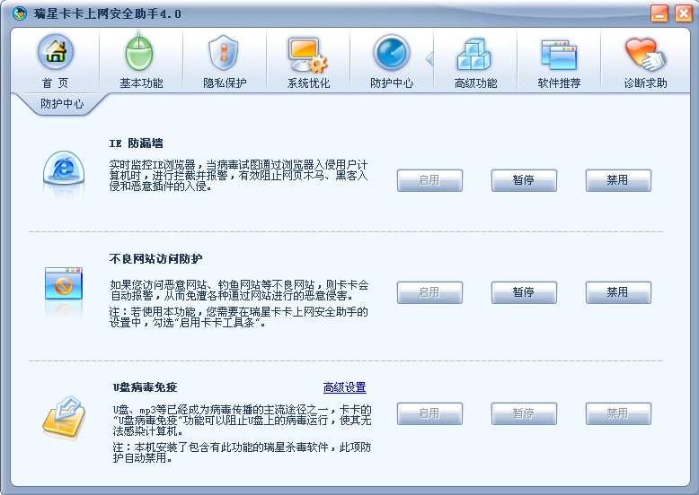 瑞星杀软有此功能,卡卡的停用,是不是这样呀.