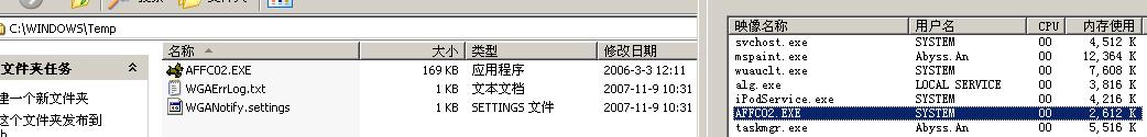 从新开机后,这次的病毒进程是AFFC02.exe,下面是截图