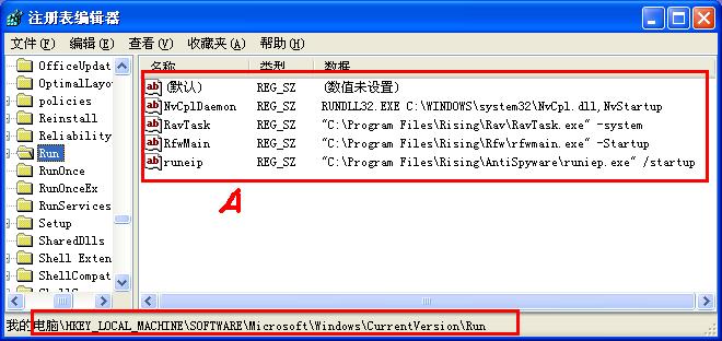 二、定位注册表到HKEY_LOCAL_MACHINE\SOFTWARE\Microsoft\Windows\CurrentVersion\Run,点一下“RUN”子项,然后在下图A处找到数据为c:\program files\3721\cnsm.dll的值项,右键之,选择“删除”,然后重启电脑。