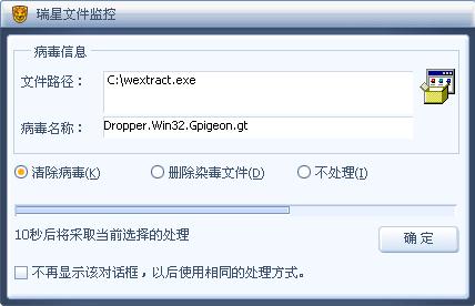 今日,我发现自己的电脑中了病毒Dropper.Win32.Gpigeon.gt,然后认真看了一下,发现是系统文件C:\WINDOWS\system32\dllcache\wextract.exe,而且所在的路径也是改系统文件所在的正确路径,因瑞星提示为WIN32类型病毒,所以估计为带传染性修改可执行文件的病毒,我点清除病毒,发现瑞星执行的是删除文件,而不是清除病毒。然后我在原版XP光盘上复制wextract.ex_文件,然后用expand命令释放文件,有趣的事情发生了,瑞星查到了也是Dropper.Win32.Gpigeon.gt病毒。难道微软在2004年就制造了鸽子变形病毒?