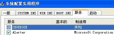 2、运行msconfig,查看服务时,会发现多出一项名为2E8EB38E的未知服务(详见附件1),此服务指向Windows\System\5B1CDBCC.exe。