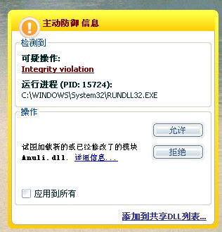 1、卡巴没有查出病毒,但主动防御狂报rundll32.exe加载Anuli.dll,允许后又弹出..勾选“应用到所有”-“拒绝”后rundll32.exe报错,卡一下就没事了