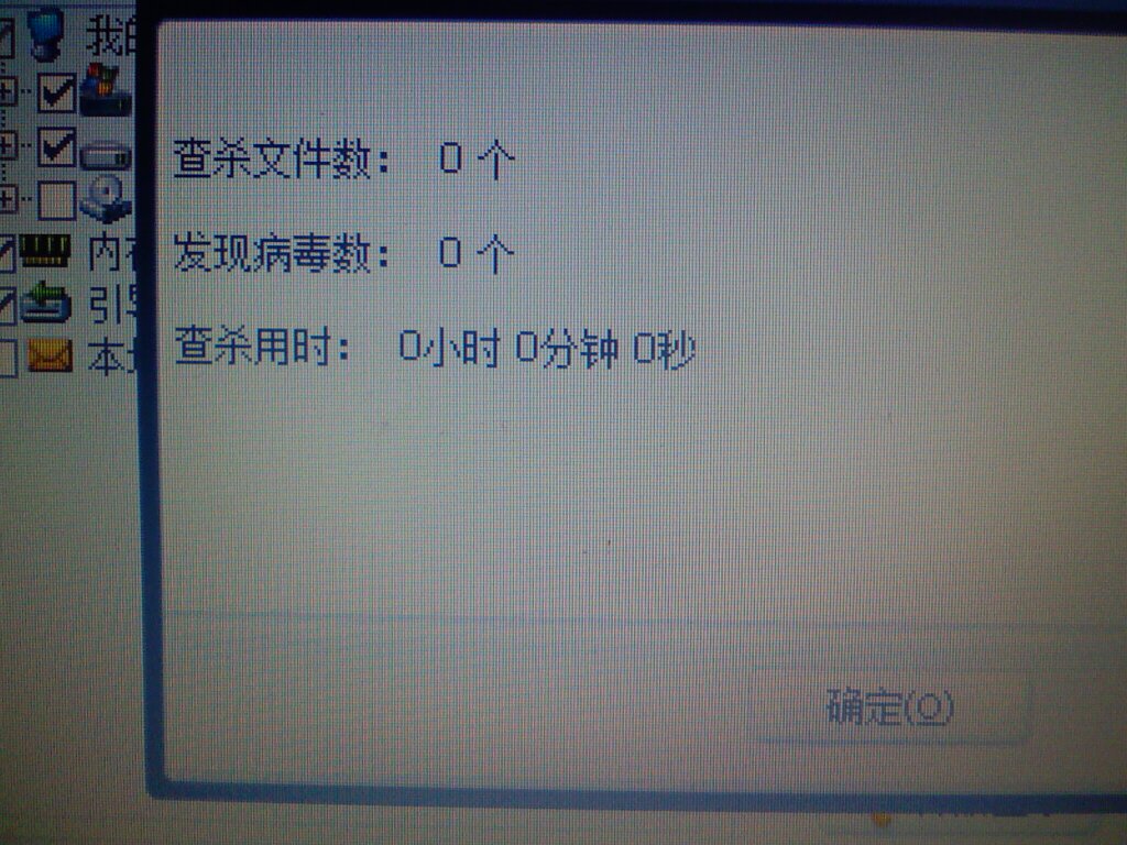 杀毒,马上就弹出一个窗口:查杀文件数0个,发现病毒数0个,查杀用时0小时0分