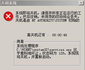 我单位的电脑这两天总是报出如下的对话框,然后就关机重启啦,不知是什么原因,只有2000系统有这种现象,一台2000服务器版本,六台2000专业版,觉得很像以前的冲击波病毒,但我的2000系统都已装了SP4补丁,不知是什么原因,请知道的大侠指点一下,怎样解决呀,多谢啦!急呀!!!