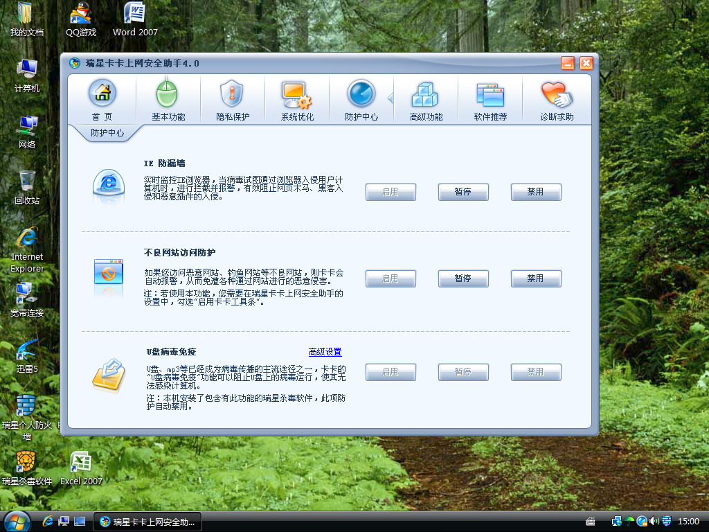 因为你安装了2008版的瑞星杀毒软件,杀毒软件已经有相同的功能了,所以卡卡自动把这个U盘病毒免疫禁用了,这是正常的,注意看一下截图中的提示