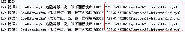 RVA  错误: LoadLibraryA (危险等级: 高,  被下面模块所HOOK: \??\C:\WINDOWS\system32\drivers\klif.sys)