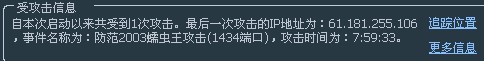 防火墙提示是“防范2003蠕虫攻击(1434端口)”