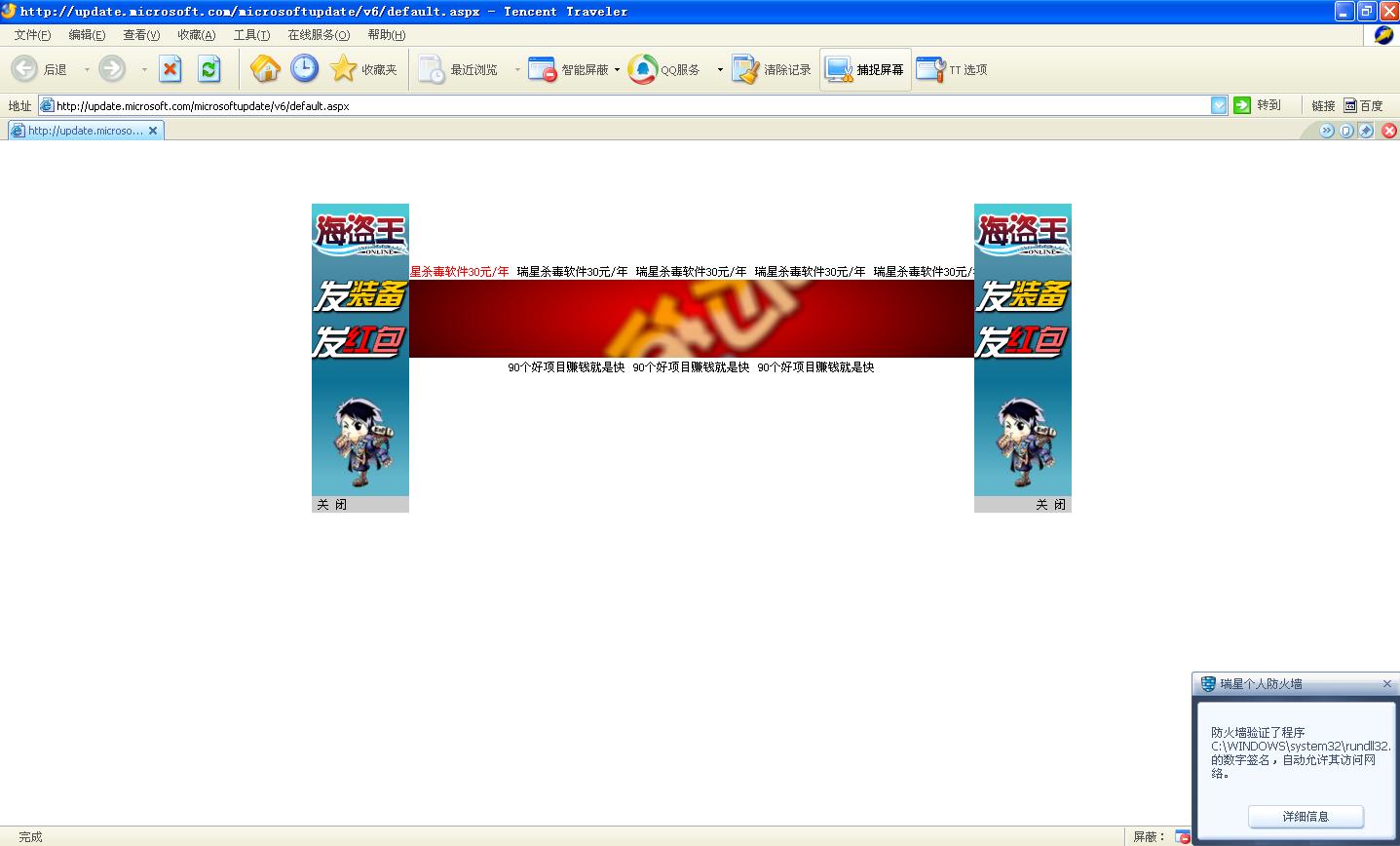 为什么当我访问某网页(不是每次都出现这个情况),有时候就会变成(注意不是弹出)可恶的广告页面?大概等5秒钟,广告页面就会消失,接着又跳转到我欲访问的网页页面?已经查毒,没有找到病毒。我再补充一下,我总结了出现的频率,发现访问微软官方更新网站时出现的频率比较高,每次出现广告时,瑞星个人防火墙就会弹出“防火墙验证了程序c:\windows\system32\rundll32.的数字签名,自动允许其访问网络。”我到防火墙里把这个访问规则给阻止了,但再次访问微软更新网站时防火墙仍然显示“自动允许其访问网络”,广告页面仍然存在。