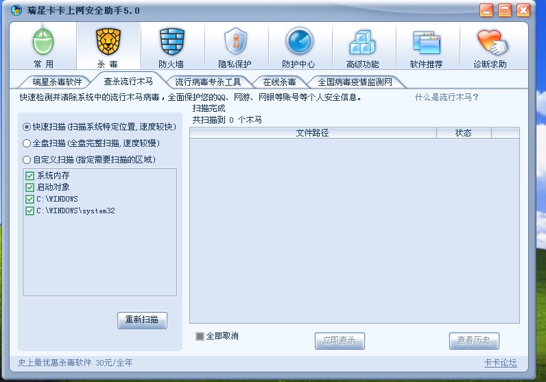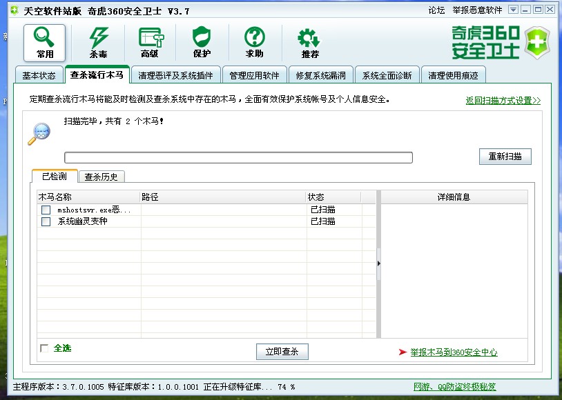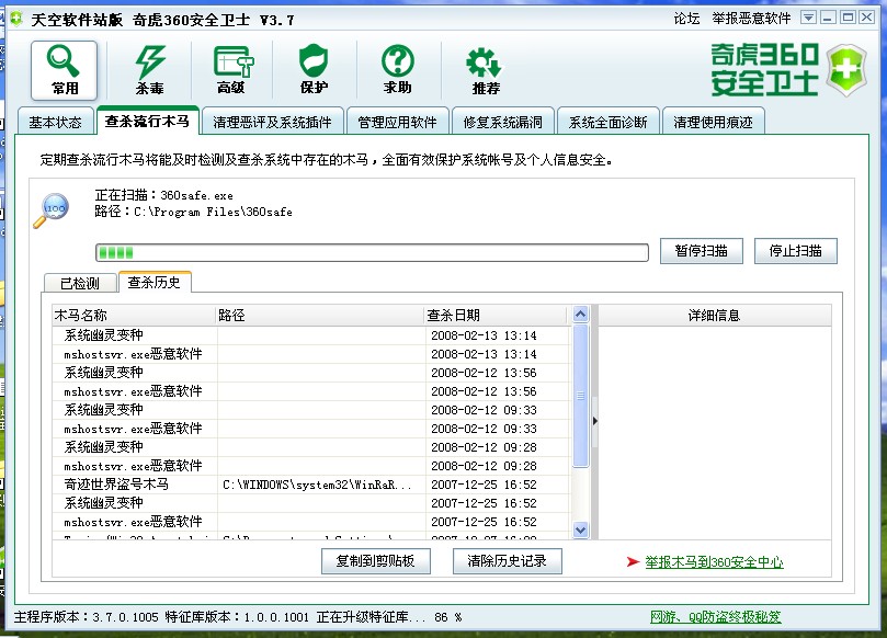 诸位大侠们,本人电脑感染这个“系统幽灵变种”不知所措。某日,要升级奇虎360,360发现我电脑感染此木马,不急,既能发现就能治,我就杀呀杀啊,未果。听朋友说瑞星上网助手试试,就下载了杀杀。。。急啊,连有这个木马都没有查出来。大家帮帮忙,给想想办法啊,拜托了。。。。。。