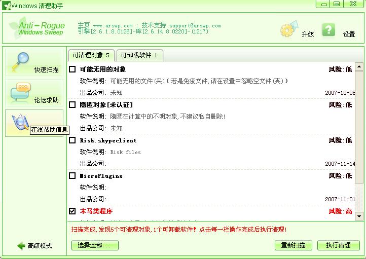 刚刚又用windows清理助手查了一下发现又多了一个木马,我中午才刚杀完啊,真想冲进电脑去决一死战.我截了张图: