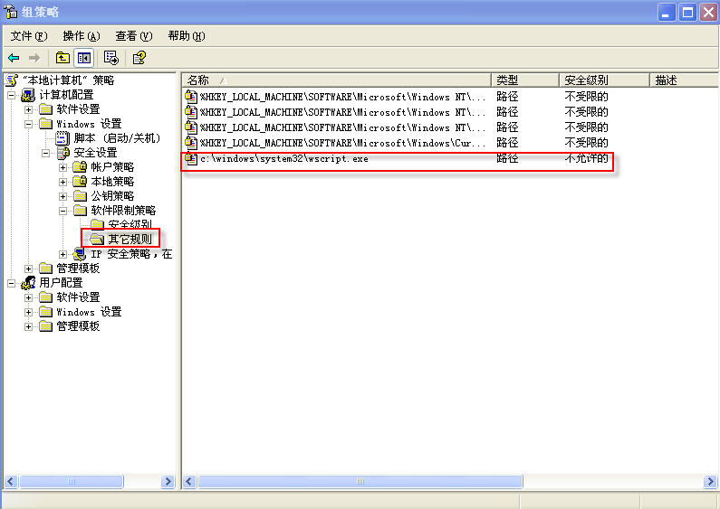 1、在“软件限制策略”中禁掉c:\WINDOWS\system32\wscript.exe(图1)