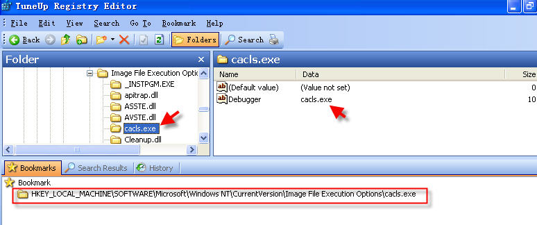 1、在注册表中添加IFEO劫持项,劫持cacls.exe(磁碟机完全运行的必需系统程序,图1)。