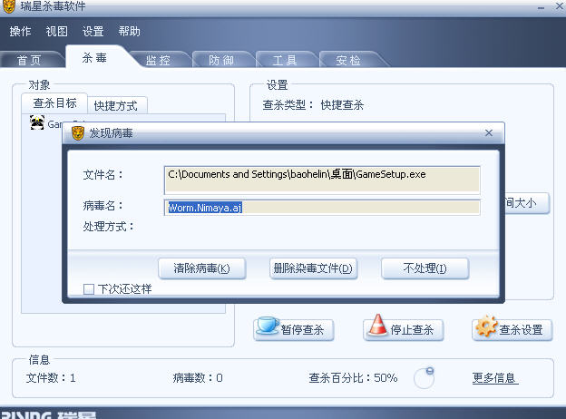 GameSteup.exe(图标和熊猫烧香的一样)!只有在共享的文件下有,用熊猫烧香专杀工具杀不掉!文件名是GameSteup,在局域网中出现,只要文件共享,就会马上感染上此病毒!