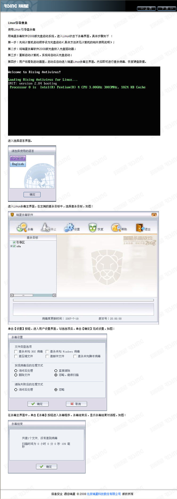 作为一种选择,中招前已经及时更新过瑞星病毒库的用户,可以用瑞星2008光盘启动系统到LINUX环境下杀毒。只要瑞星病毒库已经收录了所中的病毒,应该可以解决问题。