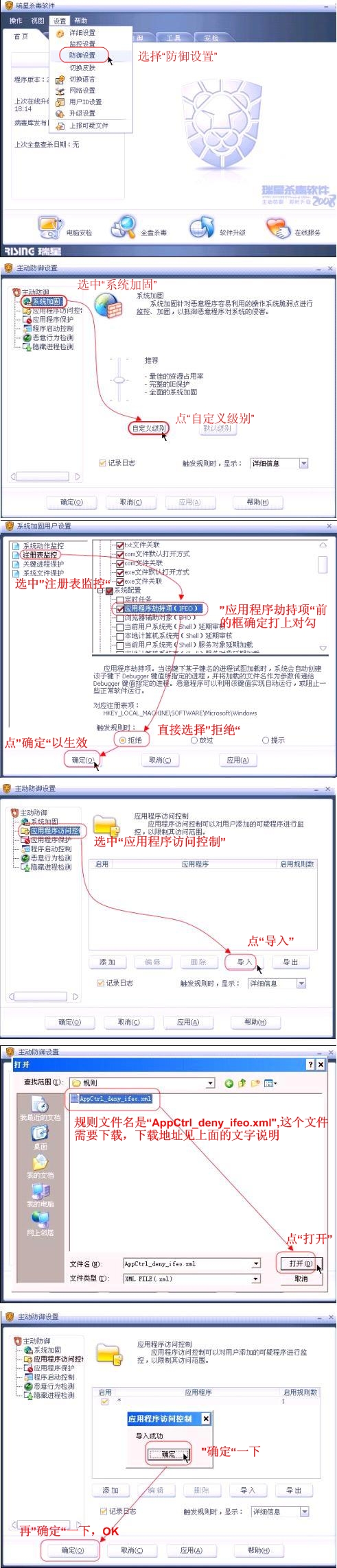 方法一、使用瑞星杀毒软件主动防御保护“映像劫持(应用程序劫持项)”的设置方法见下图。