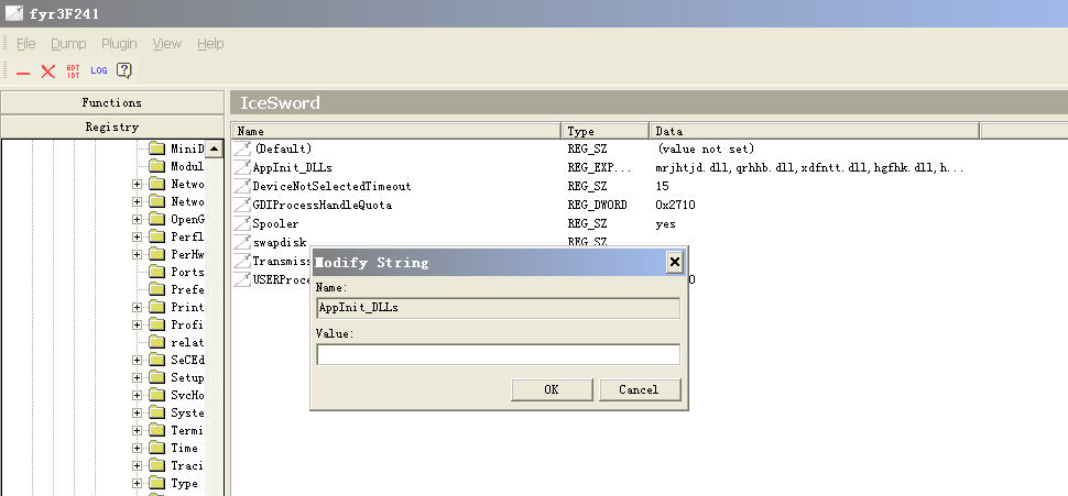 8、重启。用IceSword删除病毒添加的AppInitDlls(或将该键值清空;图4)。