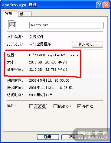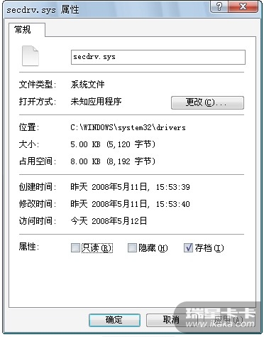 WINDOWS XP SP3操作系统下,C:\WINDOWS\system32\drivers\secdrv.sys这个系统驱动文件是下图这样的,SP2的忘记截图了: