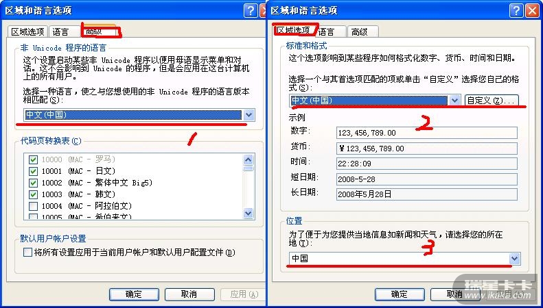 另外,请确认“控制面板--区域和语言设置”的如下3处设置正确: