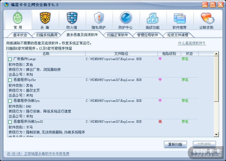 我的卡卡,发现恶意流氓软件5个,清除不了!