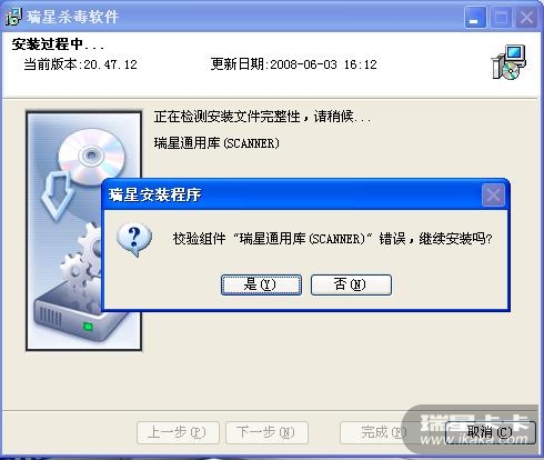 启,运行瑞星修复程序则出现“检验组件瑞星通用库(SCANNER)错误”的窗口: