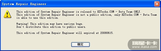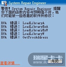 刚才在"天月来了"那里下载了个SREng2.6版,可是一打开就出现一个英文提示框,按确定后又出现另一个英文提示框,也不知道上面说什么。再次按确定,右下脚就出来一个警告框,说有函数内容与预期不符,我点修复入口点错误却提示不支持系统当前状态。附图: