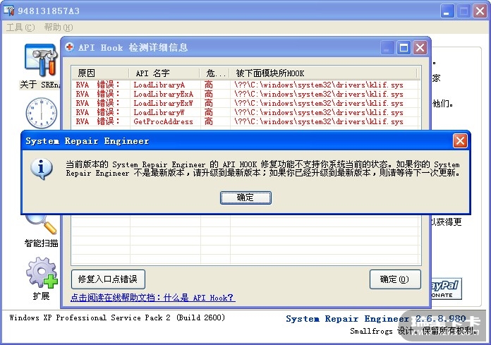 不要用SRENG扫描工具修复那些“入口点错误”,那是卡巴搞的,正常,根本不需修复……
