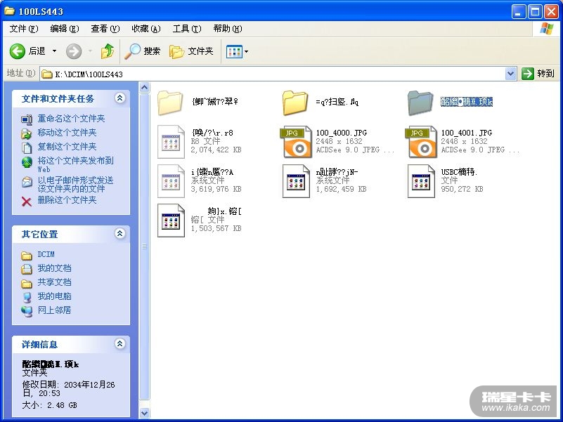 我的相机存储卡只有128M,可是在借给别人用一次后,存储卡出现了怪问题,卡上多出了一些乱码的文件夹和文件,大小显示为1.9G,点右键看属性大小又为0,用瑞星查,无毒,删除不了.截图如下.