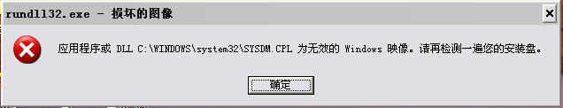 rundll32.exe-损坏的图像(应用程序或DLL C:\WINDOWS\SYSTEM32\SYSDM.CPL为无效的WINDOWS映像。请再检测一遍您的安装盘)。