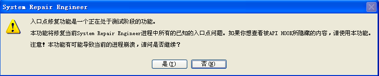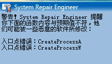不过,我心中始终有一疑问想请教一下高手:就是用在打开System Repair Engineer扫描日志时,在屏幕右下角老是出现的警告对话框,以及日志中出现的与此相同的内容,本本出现这种现象有问题吗?什么是API HOOK,它出现入口点错误,对本本的安全有没有什么影响?