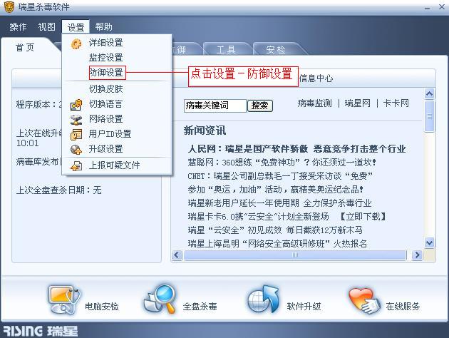 打开瑞星杀毒软件,点击设置中的防御设置:
