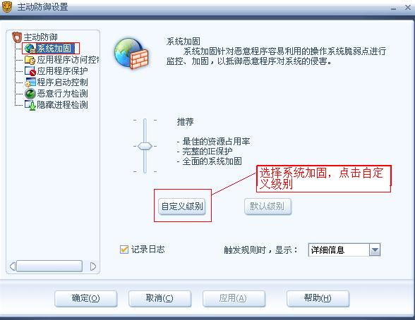 在主动防御界面点击系统加固,选择自定义级别: